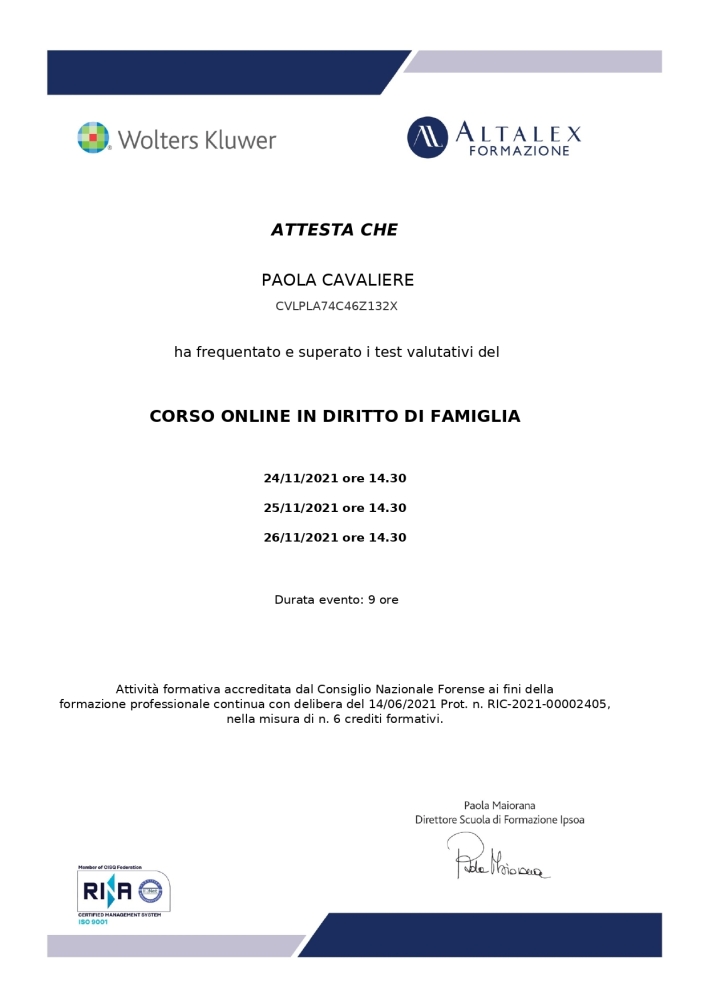 Frequento regolarmente corsi di aggiornamento professionale. Ho conseguito l'attestato da Altalex per aver superato il corso in diritto di famiglia nel novembre 2021.Ho tenuto dei corsi per il centro di formazione del consiglio dell' ordine degli Avvocati di Genova, ho scritto un libro insieme ad altri colleghi, ho pubblicato alcuni articoli su riviste giuridiche, sono stata per nove anni consulente di una multinazionale e ad oggi faccio parte dell'organizzazione Sindacale degli Avvocati di Genova.