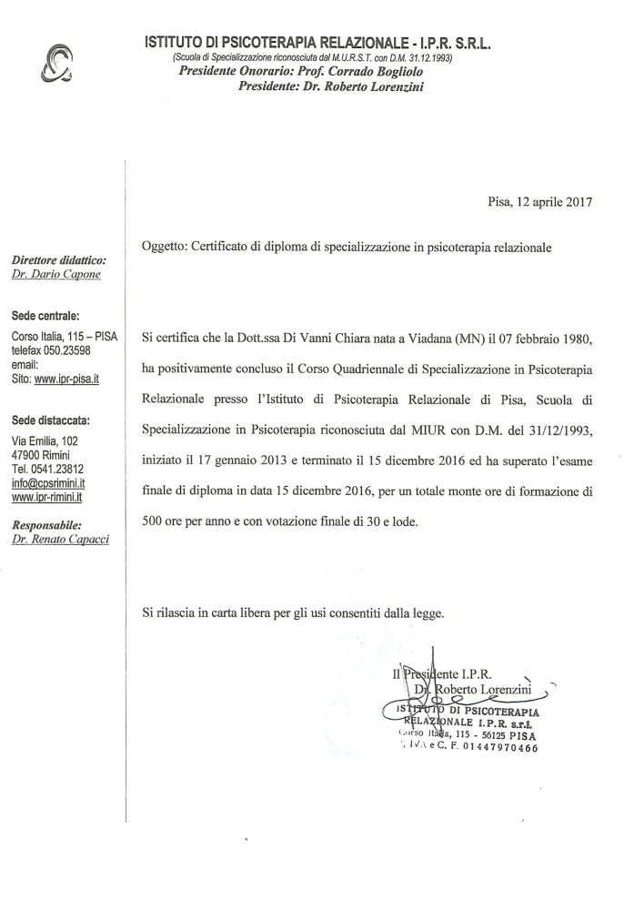 Specializzata con LODE in Terapia Sistemico Relazionale a Pisa